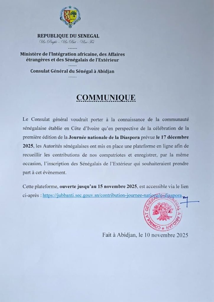 Le Consulat général voudrait porter à la connaissance de la communauté sénégalaise établie en Côte d’Ivoire qu’en perspective de la célébration de la première édition de la Journée nationale de la Diaspora prévue le 17 décembre 2025, les Autorités sénégalaises ont mis en place une plateforme en ligne afin de recueillir les contributions de nos compatriotes et d'enregistrer, par la même occasion, l’inscription des Sénégalais de l’Extérieur qui souhaiteraient prendre part à cet évènement.